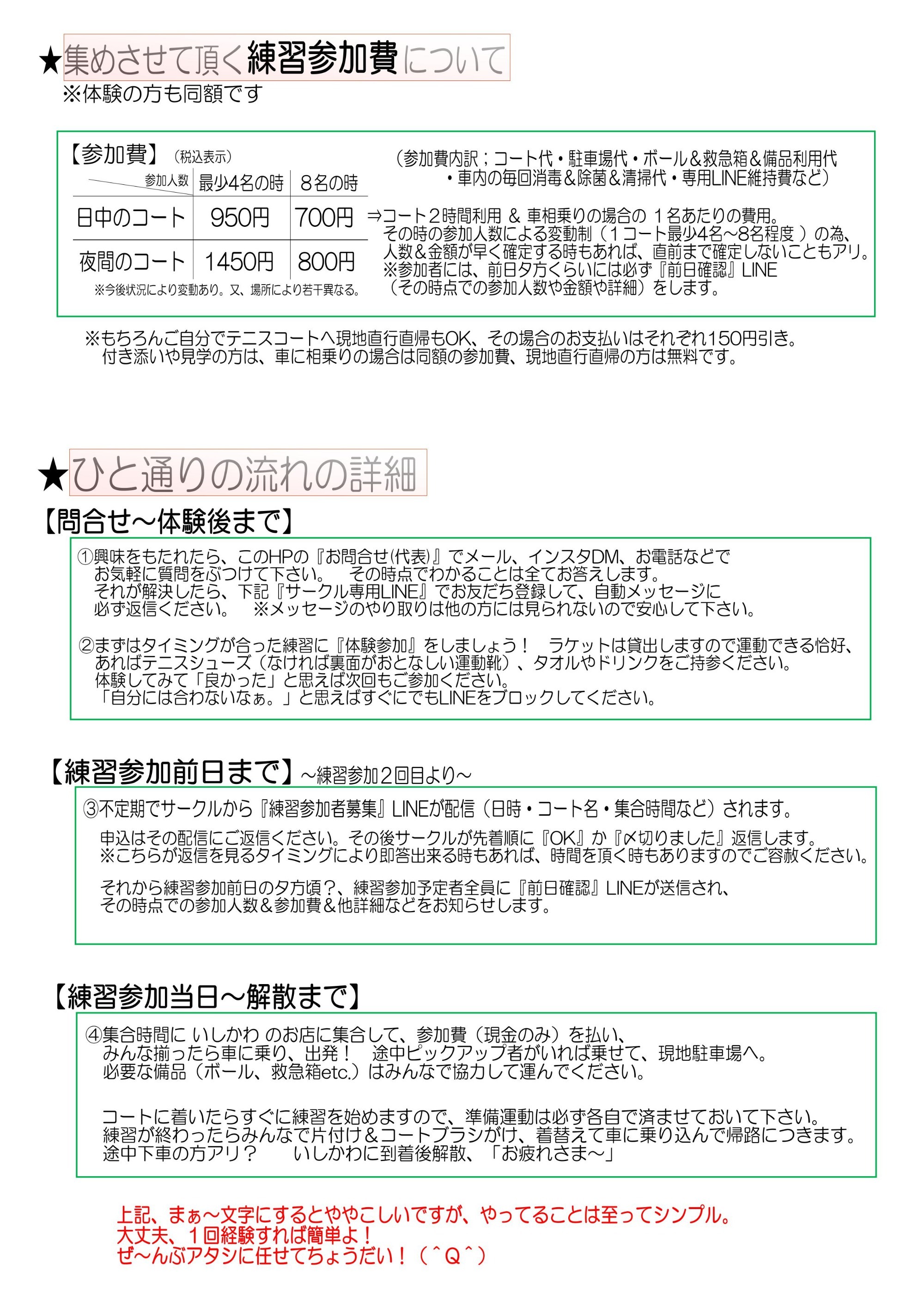 大抵のサークルは軽~い感じで詳細を提示せず募集していますが、僕にはどうしてもソレが出来ません。 「せっかく自分の大事な時間を使って練習をするなら、ある程度情報公開をしていサークルに入りたい。」と僕なら思うのでそうします。